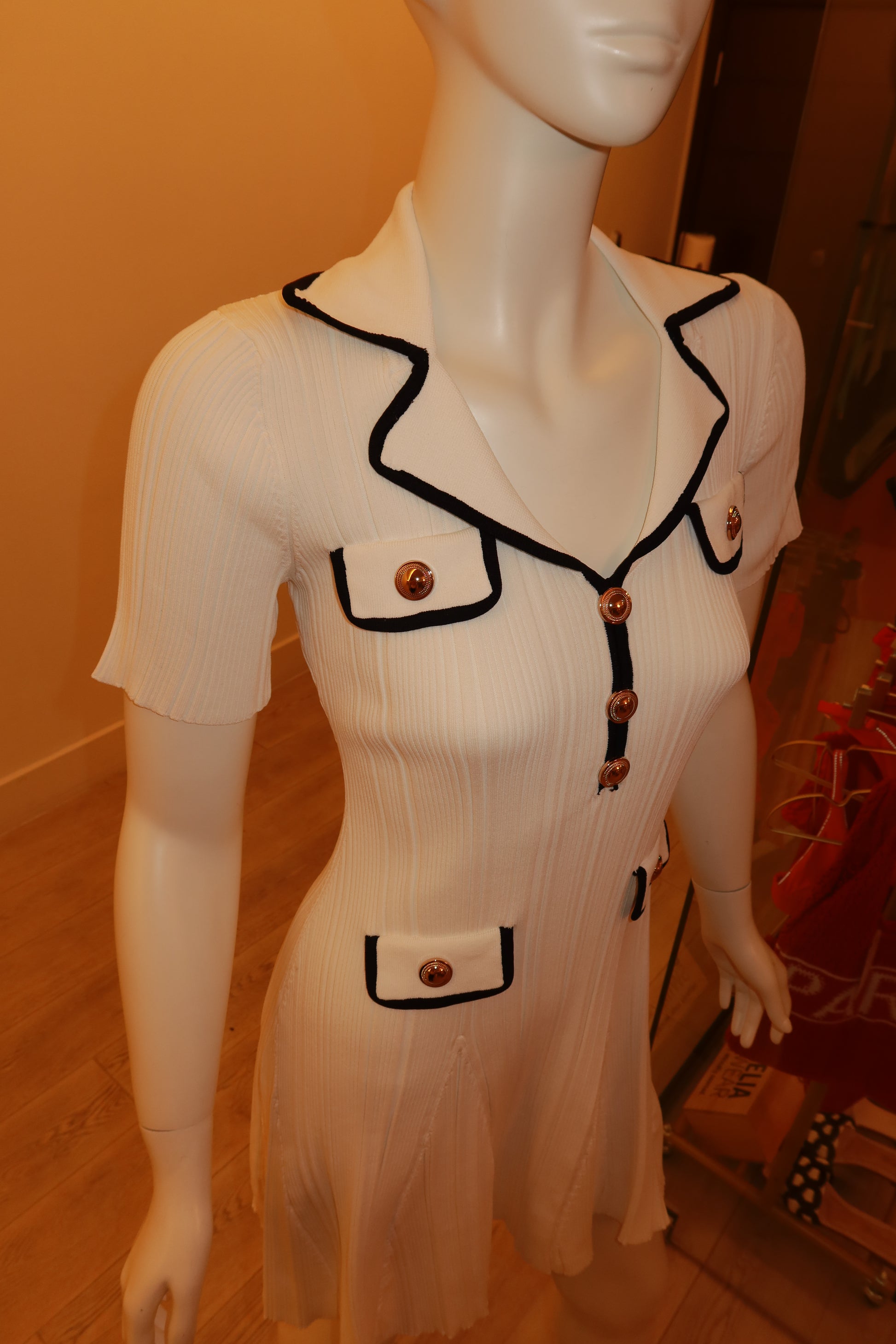 Curve-skimming rib knit mini with gold-tone buttons. Clean lines. Comfortable hold.